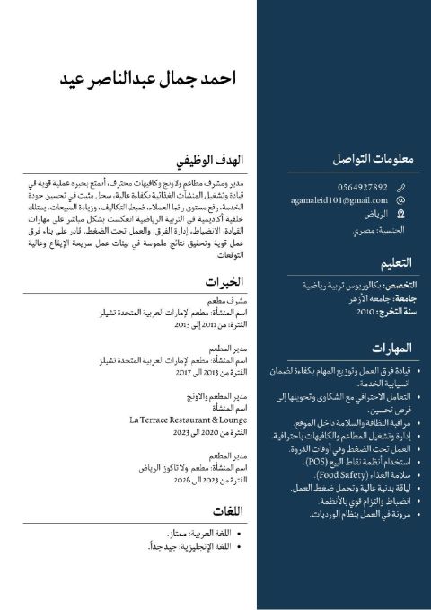 مصري مقيم في الرياض خبرة 15 عام، بالمطاعم 12 سنة في الامارات و3 سنوات في السعودية ابحث عن عمل مشرف مطعم أو مدير مطعم