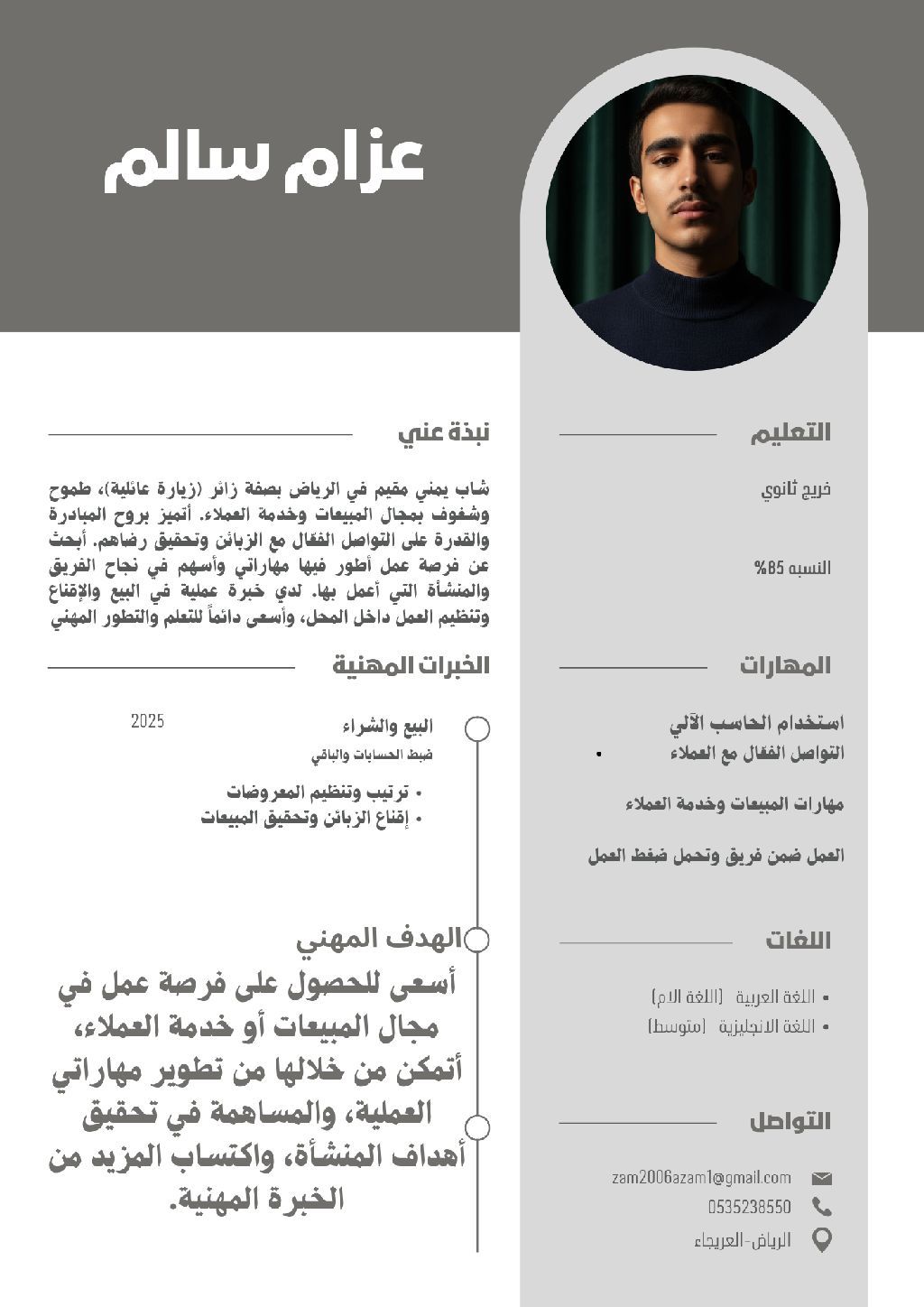 ابحث عن عمل في مجال المبيعات أو خدمة العملاء. اسمي عزام سالم، شاب يمني مقيم في الرياض بصفة زائر (زيارة عائلية) عمري 19 سنة. حاصل على الثانوية العامة ولدي خبرة سابقة في البيع داخل محل ملابس رجالية، وأجيد التعامل مع الزبائن وتنظيم العمل. امتلك مهارات في التواصل، خدمة العملاء، المبيعات، واستخدام الكمبيوتر. ابحث عن فرصة عمل لتطوير نفسي وخدمة جهة العمل بكل التزام وجدية. للتواصل