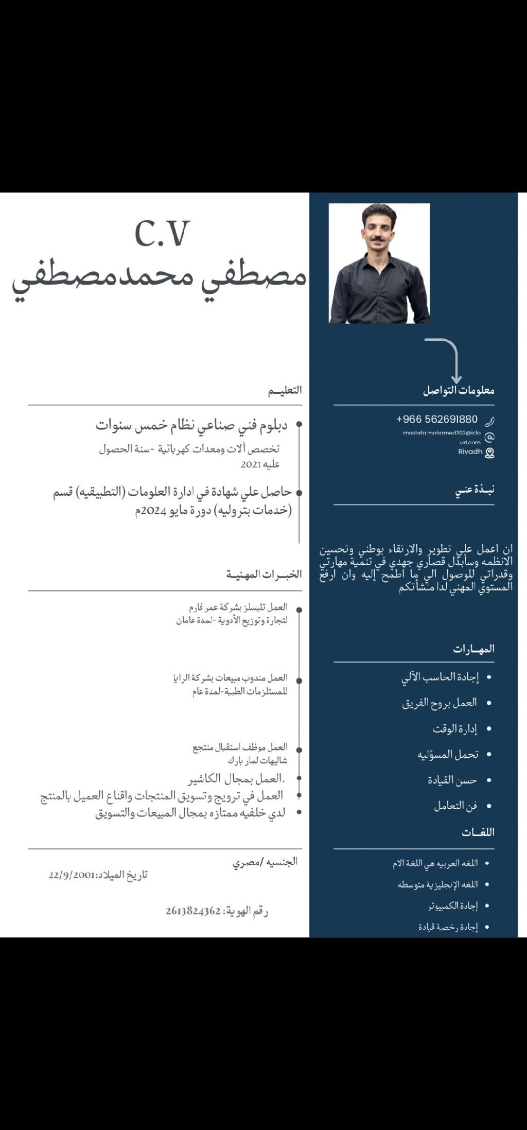 باحث عن فرصة عمل مناسبة داخل بيئة احترافية تساعدني على التطور واكتساب خبرات جديدة. امتلك مهارات في التواصل، العمل ضمن فريق، الالتزام، وتحمل المسؤولية، وأسعى لتقديم أفضل ما لدي لتحقيق أهداف المؤسسة. جاهز للعمل فورا وقابل للتعلم والتطوير المستمر