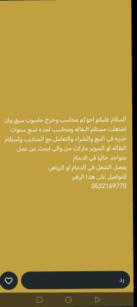 أخوكم محاسب وخرج حاسوب سبق وان اشتغلت مستلم البقالة ومحاسب لمدة تسع سنوات خبرة في البيع والشراء والتعامل مع المناديب واستلام البقالة أو السوبر ماركت من والى ابحث عن عمل متواجد حاليا في الدمام يفضل الشغل في الدمام أو الرياض للتواصل على هذا الرقم