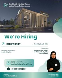 Looking for Saudi Receptionist. Experience - 2 - 5 Years. Healthcare Experience Preferred. Language Arabic and English Must