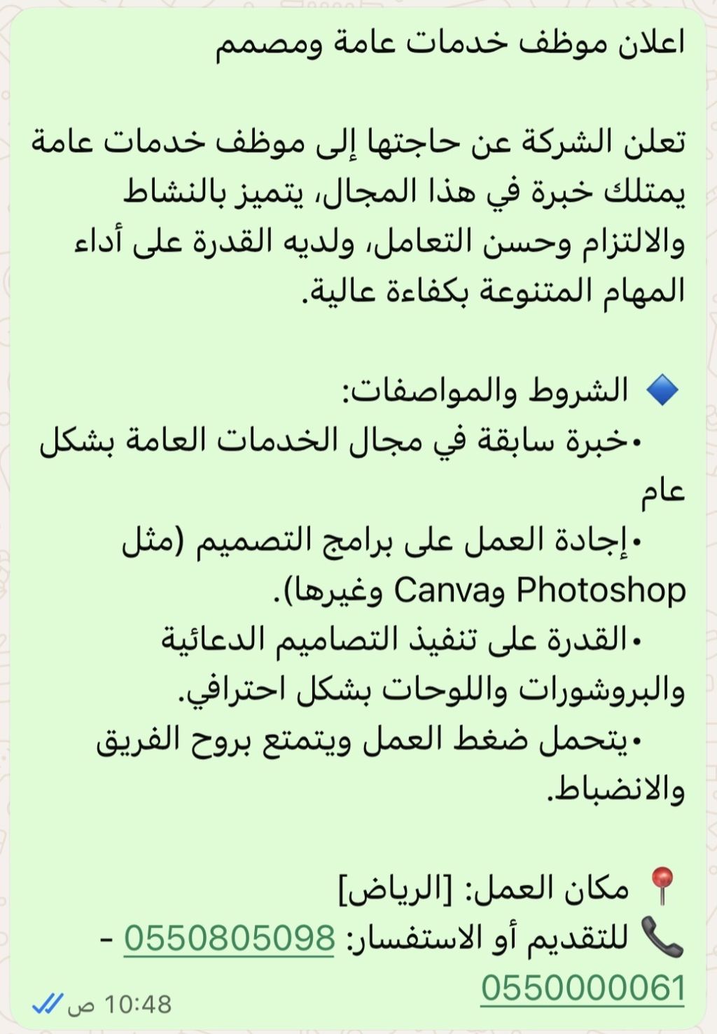 اعلان موظف خدمات عامة ومصمم يمتلك خبرة كافية في هذا المجال يتميز بالنشاط والالتزام وحسن التعامل الشروط خبرة سابقه في نفس المجال اجادة العمل على برامج التصاميم والمواقع الالكترونية والخدمات العامة في الرياض حي طويق