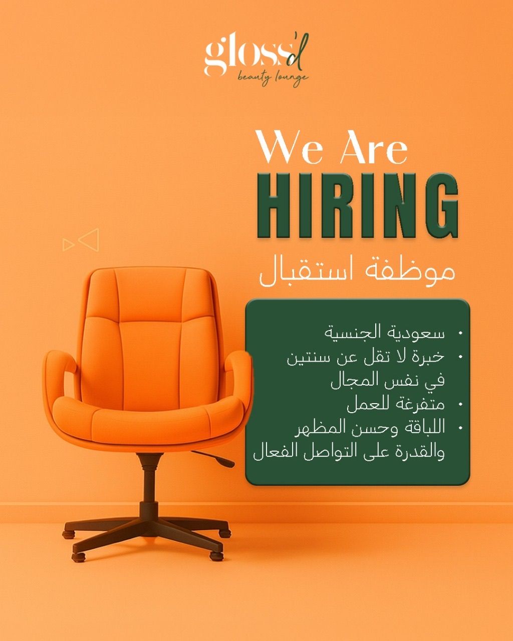 مطلوب موظفة استقبال لصالون نسائي راق في مدينة الرياض - حي الملك سلمان يعلن الصالون عن توفر شاغر موظفة استقبال على أن تتوفر فيها الشروط التالية سعودية الجنسية - خبرة لا تقل عن سنتين في مجال الاستقبال أو خدمة العملاء في صالونات التجميل - لباقة عالية وحسن المظهر والقدرة على التعامل مع العملاء باحترافية - مهارة في التواصل الفعال وتنظيم المواعيد - اجادة اللغة الانجليزية تحدثا وكتابة