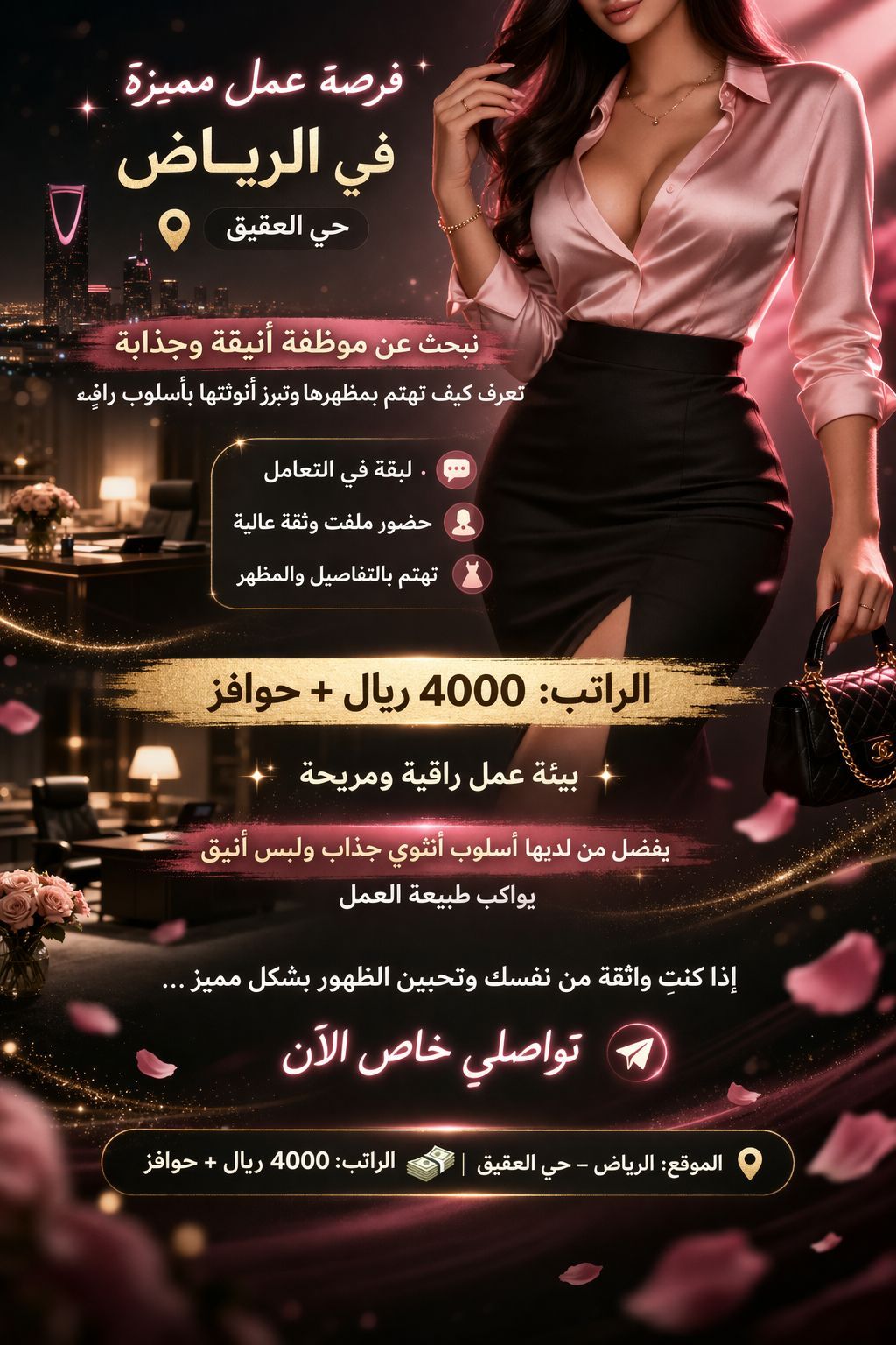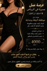 فرصة عمل مميزة في الرياض الموقع حي العقيق نبحث عن مضيفة استقبال VIP تجيد الحضور الراقي وتعرف كيف تبرز أنوثتها بأسلوب أنيق وجذاب لبقة في التعامل حضور ملفت وثقة عالية تهتم بالمظهر والتفاصيل الراتب 4000 ريال + حوافز بيئة عمل راقية ومريحة يفضل من لديها أسلوب أنثوي جذاب ولبس أنيق يواكب طبيعة العمل اذا كنت واثقة من نفسك وتحبين الظهور بشكل مميز تواصلي معنا الآن