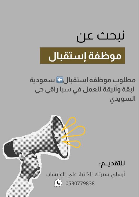 مطلوب موظفة استقبال سعودية الجنسية حي الملك فهد حاصلة علي شهادة جامعية أو ثانوية لبقة وحسنة الأسلوب) مطلوب مصورة ومونتاج وفويس أوفر تسويق محتوى شرط الاحترافية