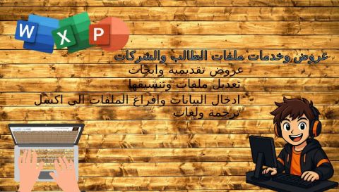 خدمات المستندات والعروض التقديمية كتابة البحوث - ادخال البيانات - تحويل أنواع الملفات الى أي نوع (اكسل، ورد، PDF) ترجمة - بحوث. تعليم وتدريب لغة انجليزية خدماتنا تتصف بالمرونة السرعة والدقة