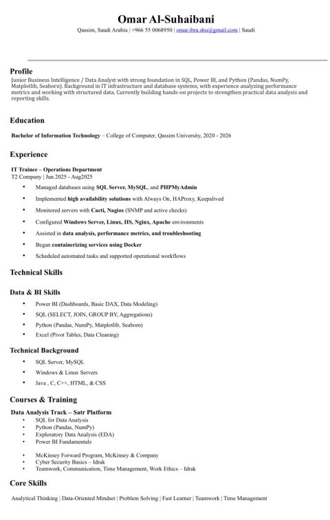 محلل بيانات / ذكاء أعمال مبتدئ يمتلك أساسا قويا في SQL وPower BI وPython (Pandas, NumPy, Matplotlib, Seaborn) لديه خلفية في البنية التحتية لتقنية المعلومات وأنظمة قواعد البيانات، مع خبرة في تحليل مؤشرات الأداء والعمل على البيانات المنظمة. يعمل حاليا على تطوير مشاريع تطبيقية لتعزيز مهاراته العملية في تحليل البيانات واعداد التقارير