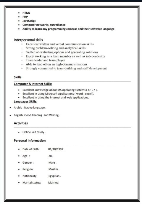 عندي خبرة سنتين في ادخال البيانات في الوورد والأكسيل وخبرة سنة في الفوتوشوب وعندي مهارة التعلم السريع على أي نظام جديد