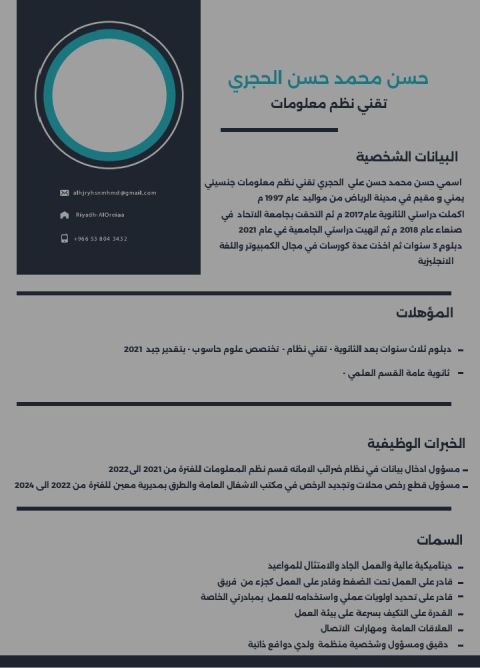 خريج جامعي حديث مجتهد حاصل على درجة البكالوريوس في تقنية المعلومات أتمتع بمهارات عالية في تطوير مواقع الويب، وتطبيقات الجوال، اعداد الخوادم، اعداد الشبكات أتميز بدقة متناهية في العمل القدرة على انجاز مهام متعددة بكفاءة عالية في أماكن عمل سريعة. التعليم. بكالوريوس في تقنية المعلومات - جامعة حضرموت (2019 - 2023) أنا وصلت الرياض ابحث عن فرصة عمل