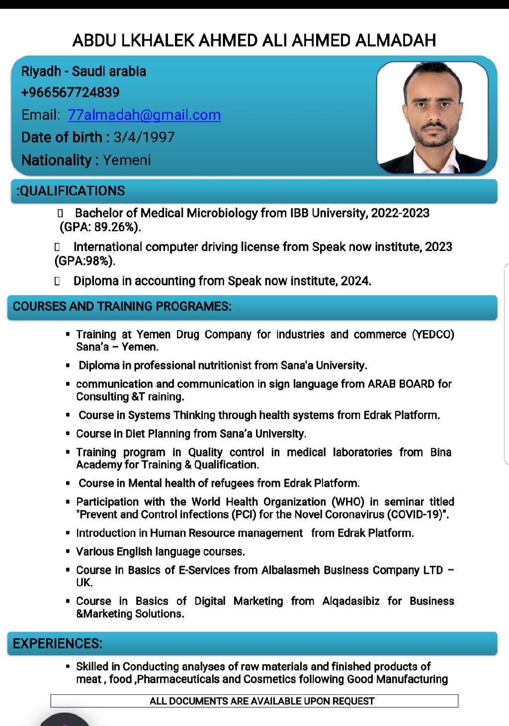 امتلك دبلوم محاسبه والرخصة الدوليه لقيادة الحاسب الآلي الى جانب بكالوريوس ميكروبيولوجي عملت مسبقا في شركة تصنيع ادوية في قسم ضبط الجودة متواجد حاليا في الرياض