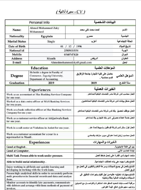 داتا انتري مصري الجنسية خبرة 5 سنوات تحليل بيانات ومراجعة العقود والفواتير، ابحث عن عمل خدمات طلابية أو سكرتارية اجادة تامة في استخدام الكمبيوتر متمرس في استخدام برامج الميكرسوفت اوفس الاكسل (EXL) والورد (Word) حاصل على بكالوريوس محاسبة اجادة لغة انجليزية متمكنة. وجاهز للعمل فورا
