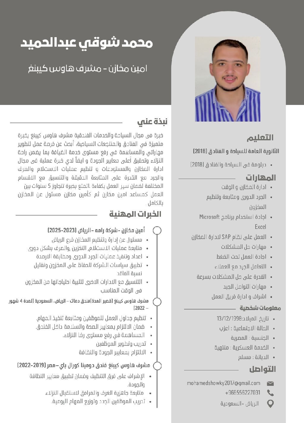 أنا أمين مستودع ابحث عن فرصة عمل مناسبة، ولدي خبرة سنتين في مجال المستودعات. لدي خبرة في تنظيم وترتيب وتخزين الأصناف. الجرد الدوري ومتابعة حركة المخزون. استخدام برامج الجرد والاكسل. استلام وتسليم المواد وفق الاجراءات المعتمدة