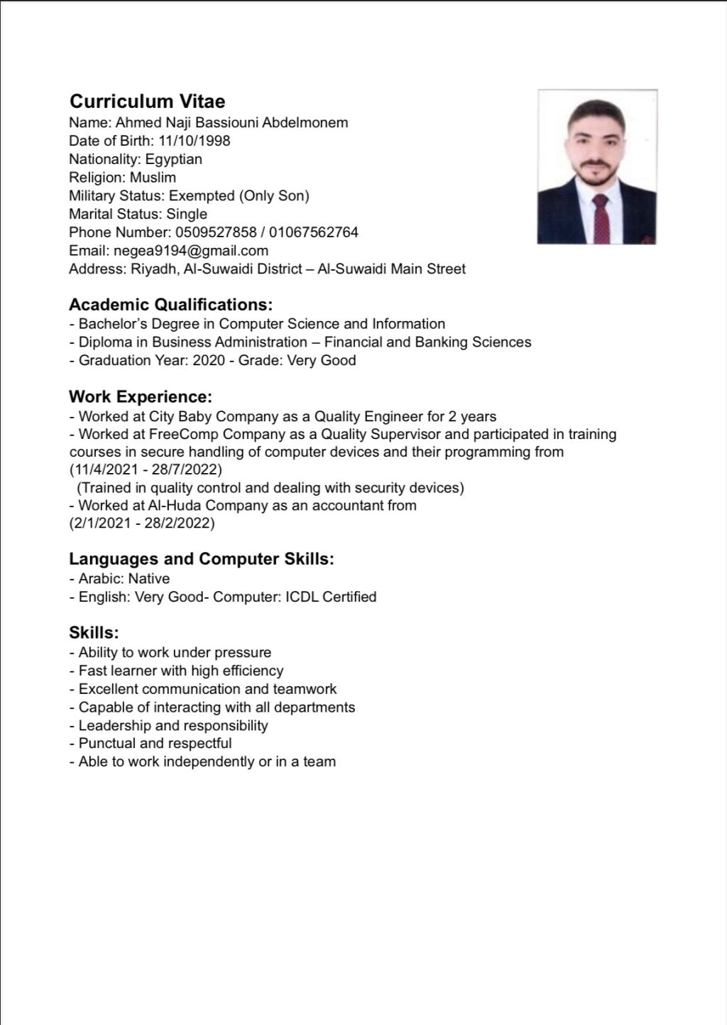 أنا أحمد ناجي بسيواني مقيم في الرياض حي الدار البيضاء وابحث عن وظيفة في مجالي الحسابي وأيضا عملت مهندس جودة لمدة عامان في مجال حفاظات الاطفال شركة نيو بيبي في مصر وآمل أن تكون بيئة عمل احترافية لرفع مستوى الكفاءة أدي وافادة بيئة العمل من خلالي بإذن الله