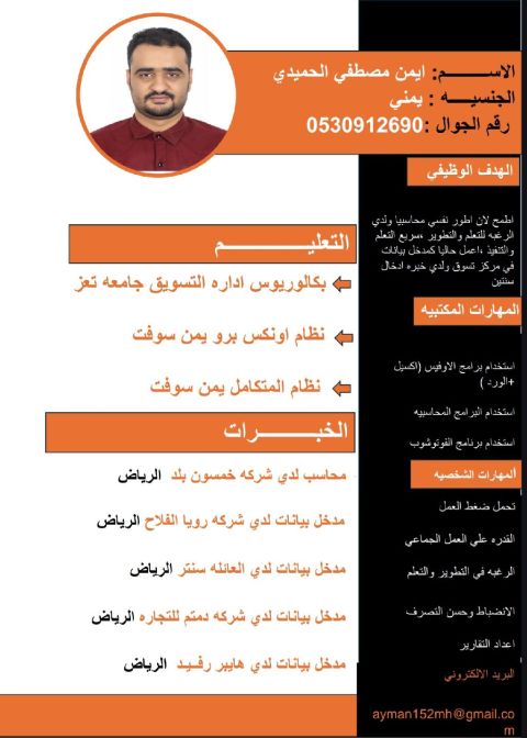 أنا خريج بكالوريوس تقنية معلومات من اليمن. لدي خبرة عملية في مجال ادخال البيانات وأرشفتها وتنظيمها لدي خبرات سابقة في مجال البيانات والمستندات في شركة تجوري لمدة سنة في مشروع أرشفة بيانات البنك الأهلي والبنك العربي ورفعها على الأنظمة ومطابقتها والتأكد من صحتها. مدخل بيانات في أسوق مواد غذائية أنا أيضا مصمم جرافيكس وأجيد استخدام برامج الأوفيس بمهارة