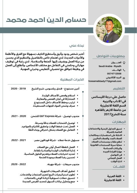 مقيم في السعودية وابحث عن عمل، امتلك مهارات تواصل قوية وقدرة على العمل ضمن فريق وتحمل ضغط العمل. أسعى دائما لتطوير مهاراتي واكتساب خبرات جديدة، وأتميز بالدقة في أداء المهام والالتزام بالمواعيد. لدي القدرة على التعامل مع العملاء باحترافية، وتنظيم العمل بكفاءة لتحقيق أهداف جهة العمل. للتواصل اتصال