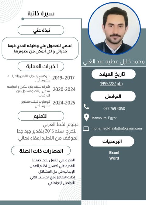 أشرف الشيخ حاصل على ليسانس حقوق أجيد استخدام الكمبيوتر أجيد المحاسبة