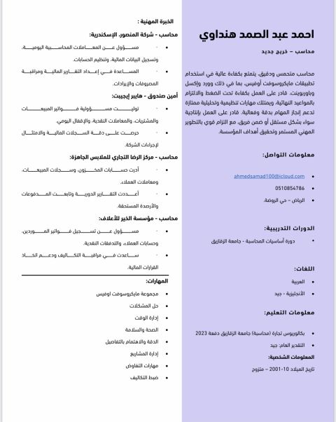 اسمي أحمد محمد عنتر، حاصل على بكالوريوس، ولدي خبرة في ادخال البيانات والتعامل مع الكمبيوتر وبرامج الاكسل والوورد، سريع ودقيق في العمل، قادر على متابعة الطلبات والبيانات بكفاءة، متاح للدوام الكامل أو الجزئي. ابحث عن فرصة عمل كمدخل بيانات