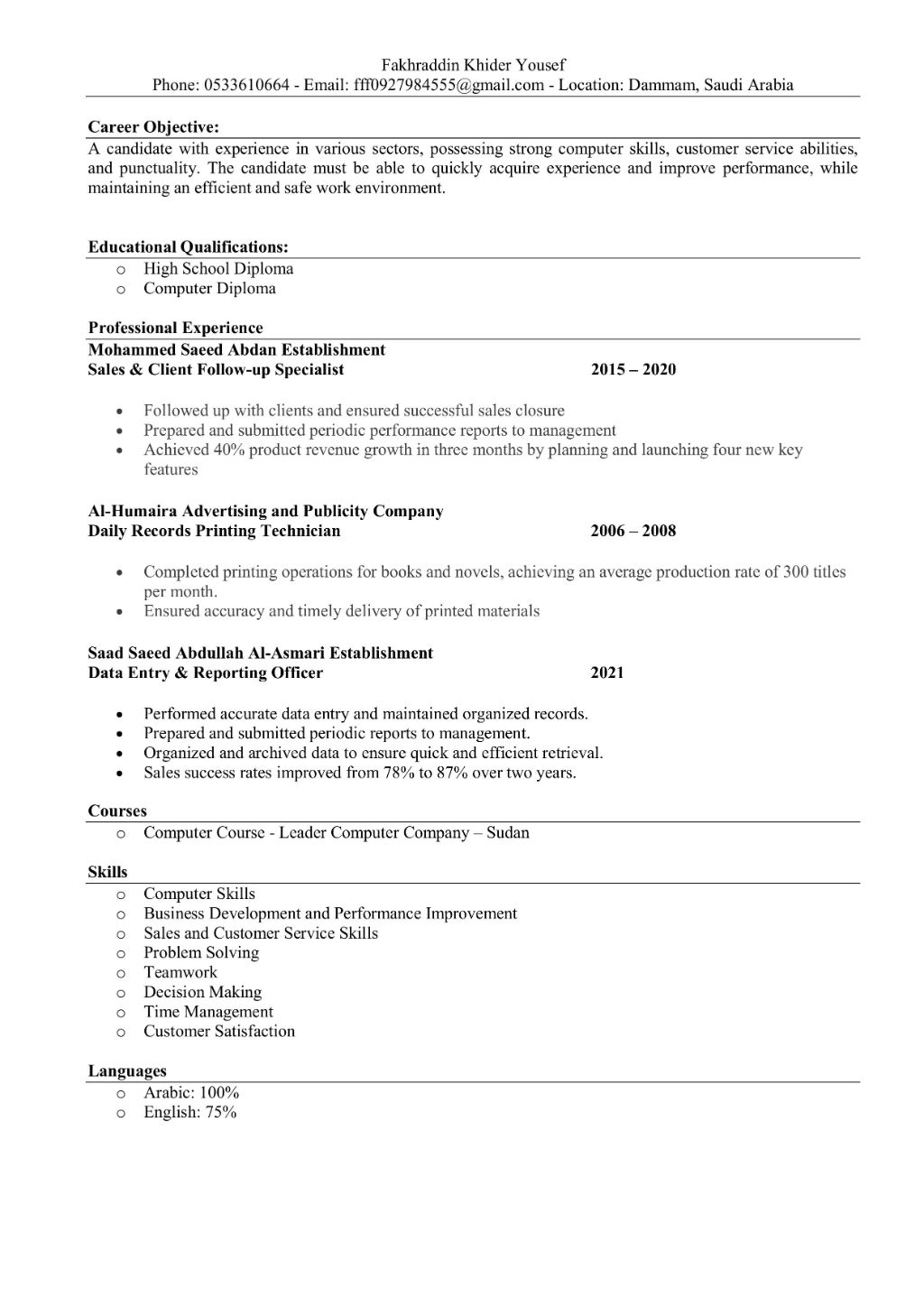 سوداني الجنسية مدخل بيانات ومعالجة نصوص محترف في ادخال البيانات ومعالجة النصوص بكافة أنواعها. متقن لبرامج مايكروسوفت، ولدي خبرة تزيد عن ثمان سنوات في ادخال البيانات ومعالجة النصوص بالمملكة العربية السعودية، مع تحمل ضغط العمل والتأقلم مع بيئة العمل