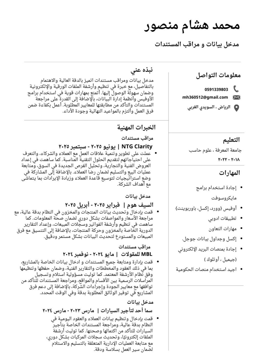 ابحث عن وظيفة مدخل بيانات وعمري 24 سنة ولدي خبرة في ادخال وتنظيم البيانات بدقة واحترافية أجيد استخدام برامج Microsoft Excel وWord وامتلك دقة عالية في التنسيق وتنظيم الملفات وأتميز بالالتزام بالمواعيد والانتباه للتفاصيل والقدرة على العمل تحت الضغط ضمن فريق أو بشكل مستقل وجاهز للعمل فورا