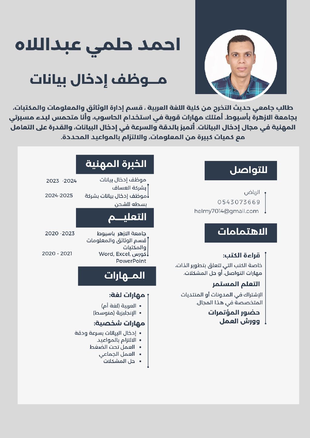 أحمد حلمي عبد اللأه مدخل بيانات ومعلومات وأرشفة الكترونية حاصل على ليسانس في الوثائق والمكتبات والمعلومات خبرة أكثر من أربع سنوات