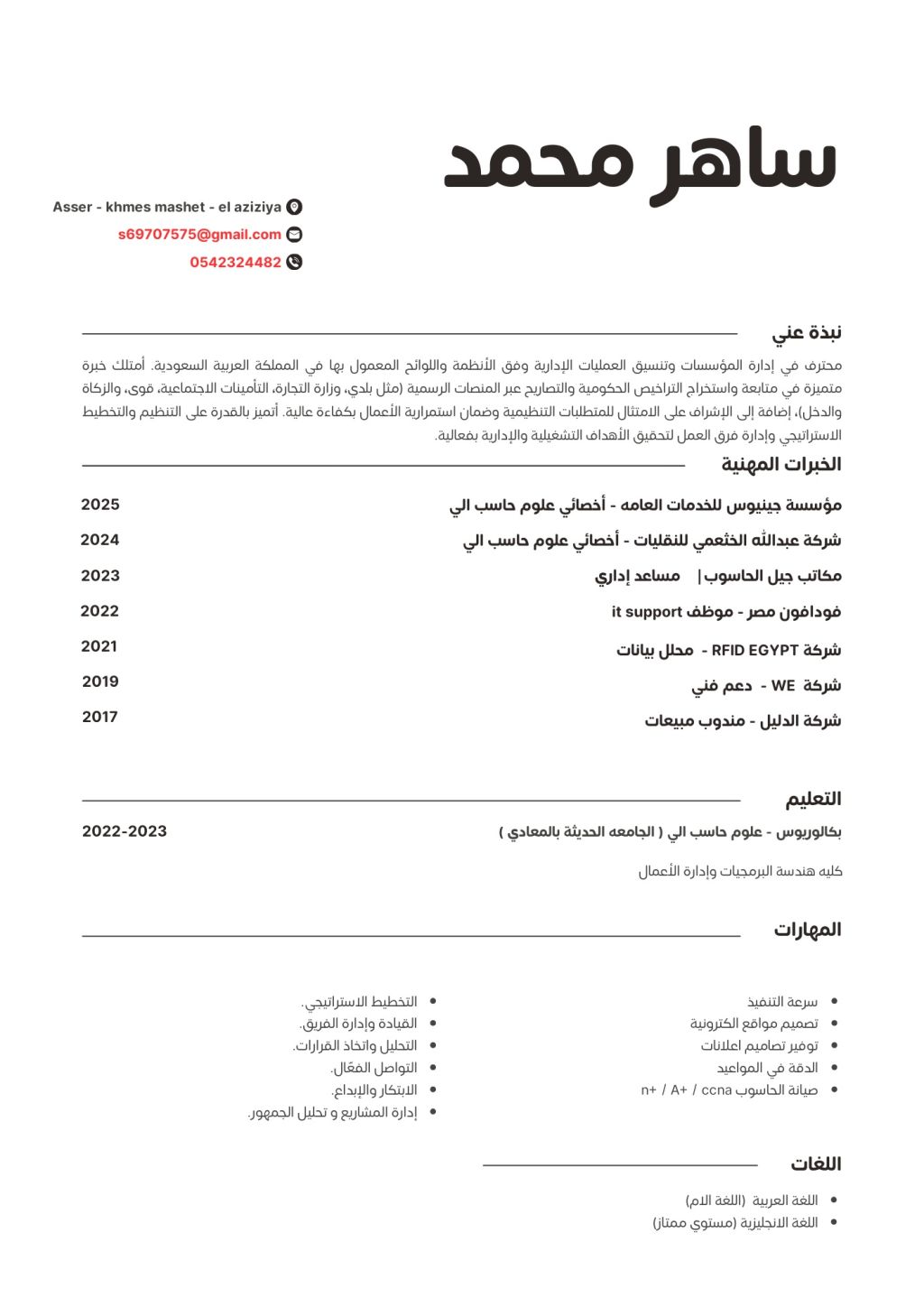 خبرة طويلة في المنصات الحكومية والتراخيص الادارية ابحث عن وظيفة ادارية أو متابع موارد بشرية المهنة في الإقامة أخصائي علوم حاسب الى