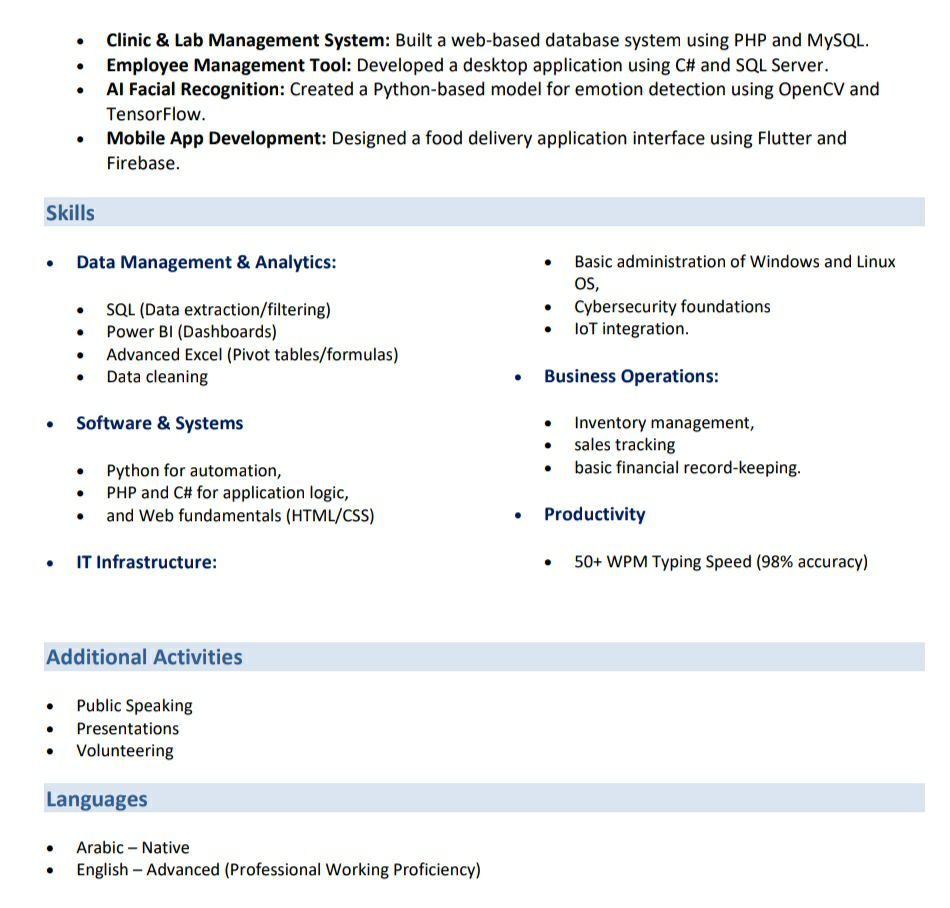 IT Professional specializing in Data Entry and Data Analysis, ranked Top 3 in my IT graduating class. Skilled in SQL, Power BI, Advanced Excel, and Python, with a proven ability to transform raw data into insightful reports and KPI dashboards that support decision - making and enhance operational efficiency. Transferable Iqama and ready to join immediately in Riyadh