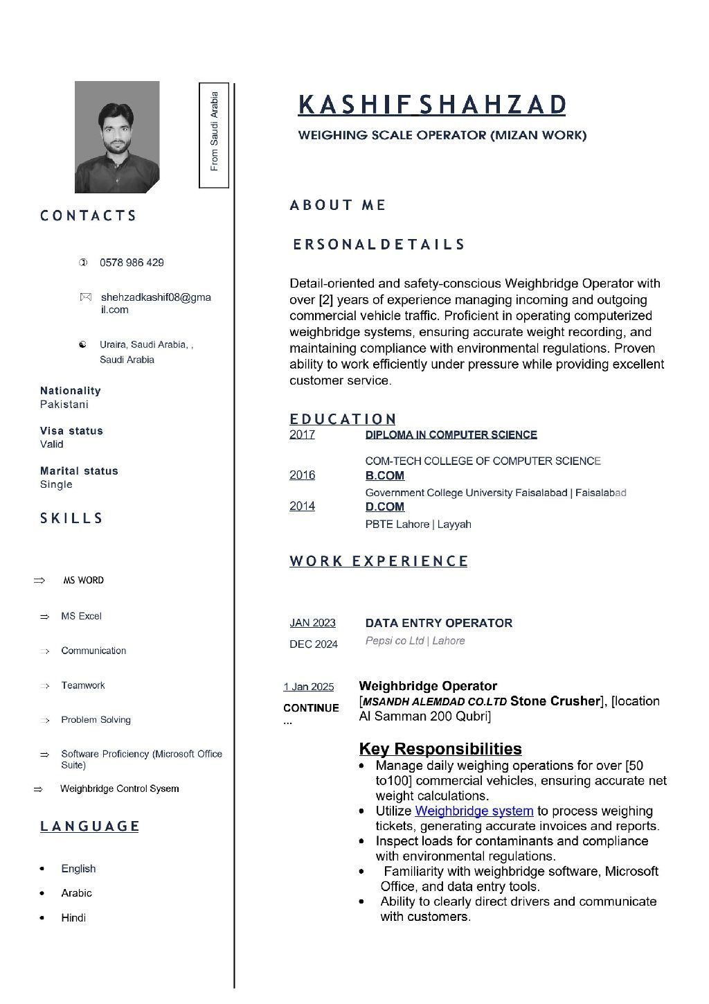 Detail - oriented and safety - conscious Weighbridge Operator with over 2 years of experience managing incoming and outgoing commercial vehicle traffic. Proficient in operating computerized weighbridge systems, ensuring accurate weight recording, and maintaining compliance with environmental regulations. Proven ability to work efficiently under pressure while providing excellent customer service