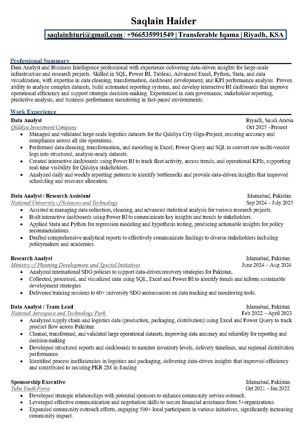 Data Analyst and Business Intelligence professional with experience delivering data - driven insights. Skilled in SQL, Power BI, Tableau, Advanced Excel, Python, Stata, and data visualization, with expertise in data cleaning, transformation, dashboard development, and KPI performance analysis. Proven ability to analyze complex datasets, build automated reporting systems, and develop interactive BI dashboards