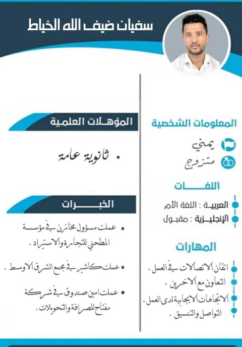 الاسم يوسف العمر 25 الجنسية يمني عملت في مجال التعقيب وتخليص المعاملات الالكترونية مثل ابشر مقيم الجوازات قوئ التأمينات الاجتماعية الموارد البشرية والطلابيه مثل بحوث ثيمات مطويات تصاميم خبرة 3 سنوات