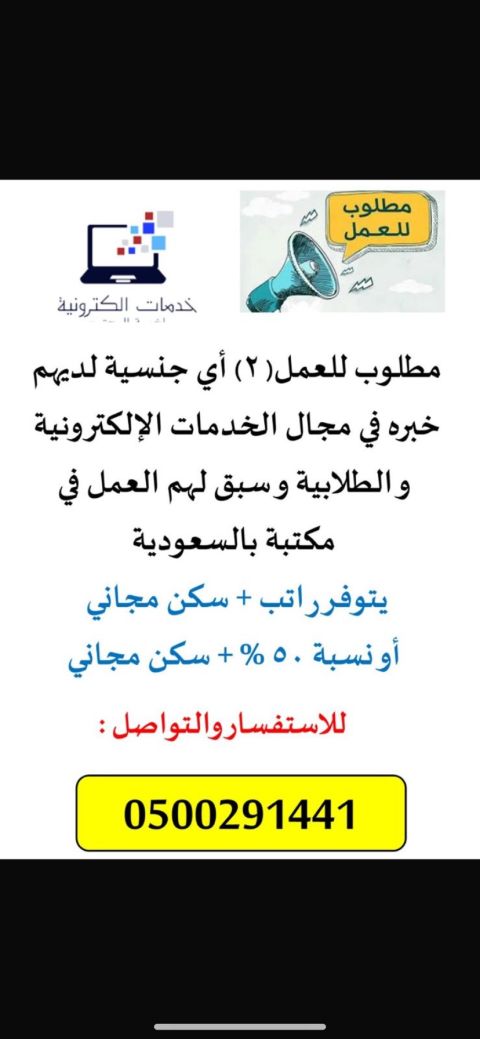 مطلوب عامل خدمات الكترونية للعمل في مكتبه الراتب يكون نسبة 50 الموقع الرياض حي الرمال / شرط الخبرة ب المجال