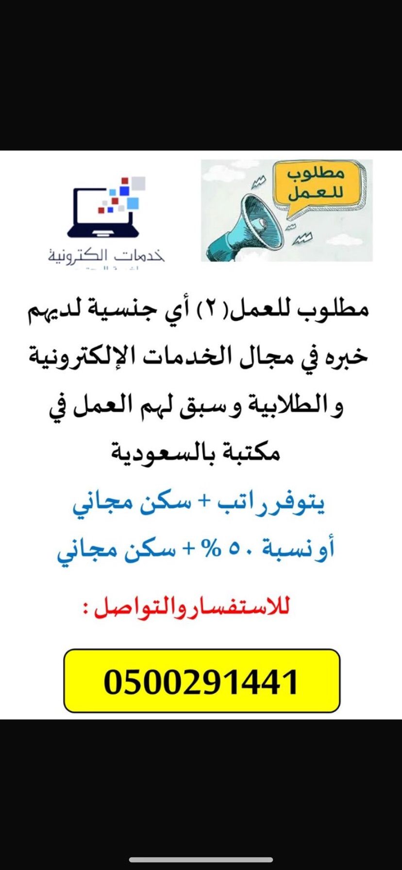 مطلوب موظف خدمات الكترونية ومنصات حكومية وطلابية عنده خبرة وسبق العمل في مجال الخدمات الالكترونية وخدمات طلابية في السعودية للعمل في مكتبة بالسليل وادي الدواسر حي الديرة السوق أهم شيء اشتغل في مكتبة في السعودية من قبل وعنده خبرة في جميع الخدمات الكترونية وطلابية
