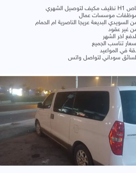 يوجد لدينا باص فان اتش ون نظيف لتوصيل الموظفات والمشاوير الخاصة داخل وخارج الرياض يوميا خدمة مريحة وباص حديث مكيف جاهز من كل النواحي داخلي وخارجي