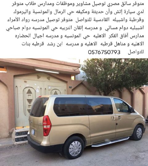 أنا سائق مصري توصيل مشاوير وموظفات ومدارس طلاب متوفر لدي سيارة إتش وأن حديثة ومكيفه حي الرمال والمونسية واليرموك وقرطبة واشبيله القادسية للتواصل متوفر توصيل مدرسة رواد الأمراء إشبيلية ومدرسة اتقان التربية حي المونسية ومدرسة ومناهل قرطبة الأهليه أسعار تنافسية