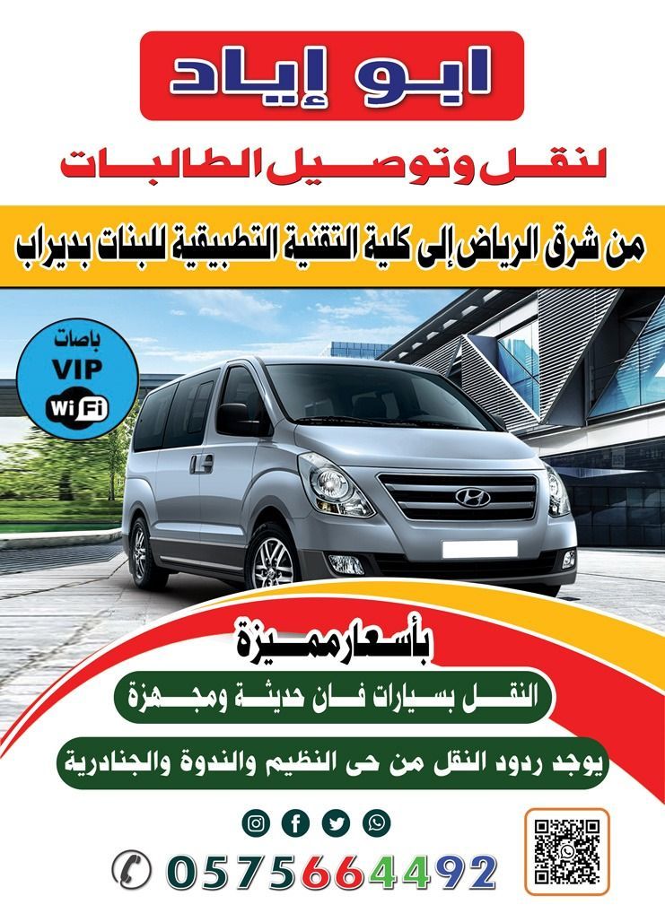 أبو إياد، لنقل وتوصيل الطالبات من شرق الرياض الى كلية التقنية التطبيقية للبنات في ديراب سيارات فان حديثة ومجهزة WiFi يوجد ردود 8 10 12 والنقل يتم من حي النظيم والندوة والجنادرية للتواصل