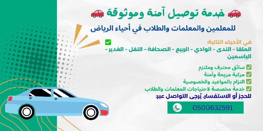 خدمات توصيل مشاوير معلمين ومعلمات وطلاب من الساعة 1:30 بعد الظهر الى 11 مساء سيارة حديثة 2024 في الأحياء التالية الربيع النفل الوادي الصحافة الياسمين الغدير الندى الملقا العقيق المصيف التواصل رقم