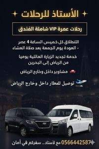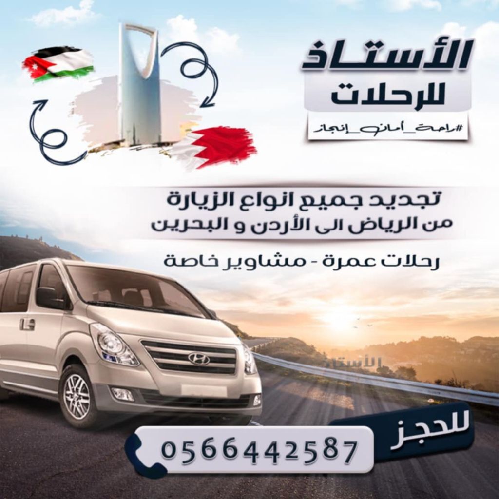 الأستاذ للرحلات رحلات - عمرة - VIP شاملة الفندق التحرك كل خميس 4 العصر - عودة الجمعة بعد العشاء سيارات H1 وهاي أس مدة الرحلة 7 ساعات متاح - تجديد - الزيارة - العائلية يوميا من الرياض الى البحرين مشاوير داخل وخارج الرياض - توصيل للمطار مع الأستاذ سفرك في أمان الرياض
