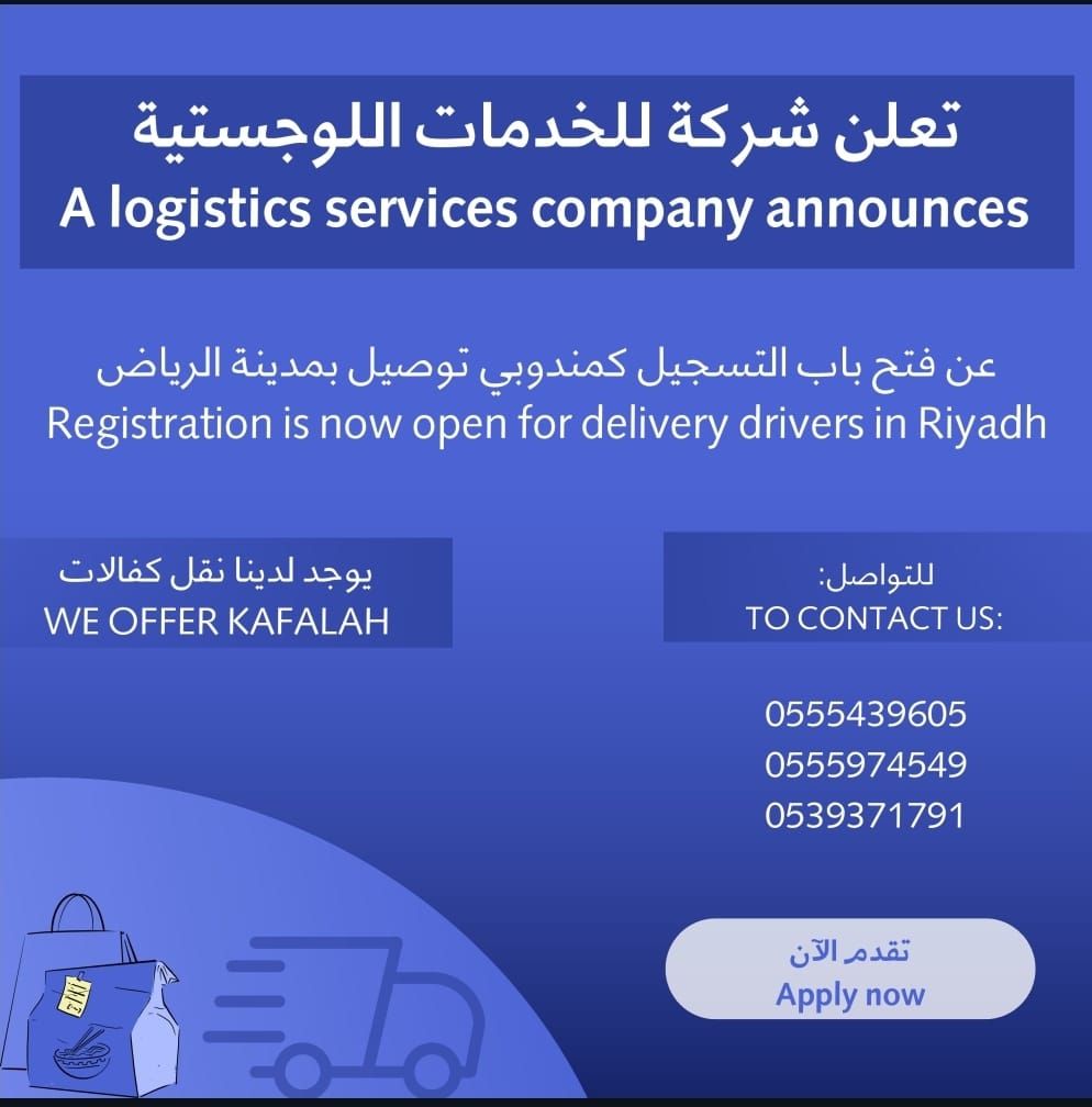 نرجب بانضمامكم الى شركة الخدمات اللوجستية نتطلع معكم لانجازات مميزة كمندوب توصيل طلبات عبر تطبيقات في مدينة الرياض حي ثليم. مميزات العمل لدينا نوفر سيارات، والبنزين، وراتب شهري ممتاز - لدينا نقل كفالات