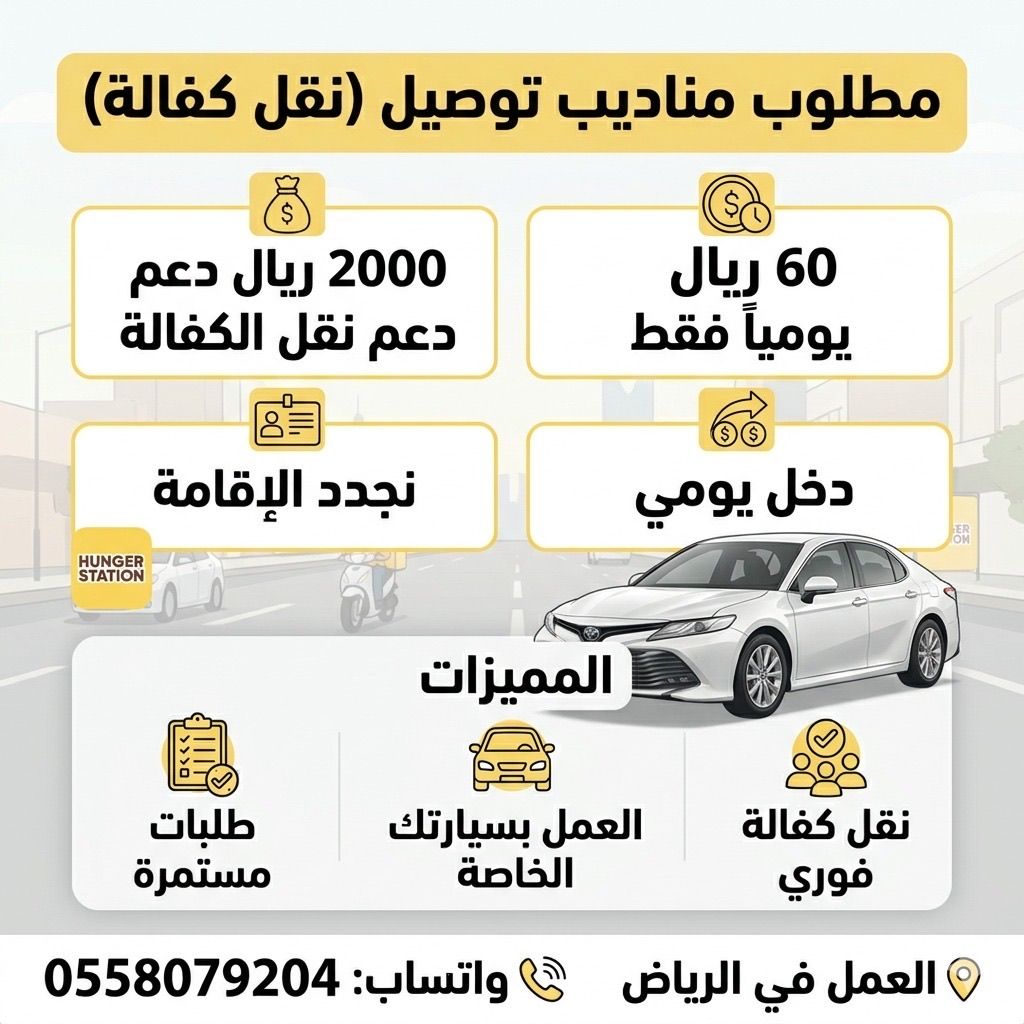 اعلان توظيف - الرياض مطلوب مناديب توصيل (نقل كفالة) للعمل نقل كفالة فوري تتحمل الشركة 2000 ريال (أول مرة) بسيارتك الخاصة طلبات يومية الدخل حسب نشاطك 60 ريال يوميا المميزات دخل جيد، تجديد إقامة، دعم مستمر الشروط نقل كفالة، سيارة، رخصة سارية الرياض - السعادة، أسواق الخنيني (مقر شركة نجمة اللؤلؤة)