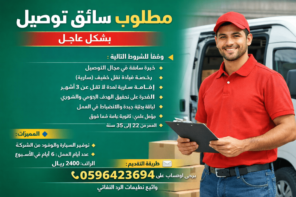 مطلوب سائق توصيل بشكل عاجل وفقآ للشروط التالية خبرة سابقة في مجال التوصيل رخصة قيادة نقل خفيف (سارية) إقامة سارية لمدة لا تقل عن 3 أشهر القدرة على تحقيق الهدف اليومي والشهري لياقة بدنية جيدة والانضباط في العمل مؤهل علمي ثانوية عامة فما فوق العمر من 22 الى 35 سنة المميزات توفير السيارة والوقود من الشركة عدد أيام العمل 6 أيام في الأسبوع الراتب 2400 ريال طريقة التقديم يرجى ارسال رسالة