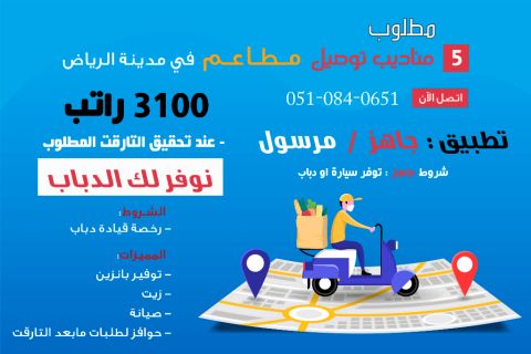 الشروط إقامة. رخصة قيادة دباب. المميزات الراتب 2500 ريال. الشركة توفر الدباب + البنزين بالكامل. لا يوجد تارقت محدد، فقط الالتزام بالدوام. الدوام 12 ساعة يوميا. بونصف مجزي عند تجاوز 35 طلب يوميا. الدوام 26 يوم في الشهر العمل في الرياض حي النسيم الغربي ضمن توصيل بقالات