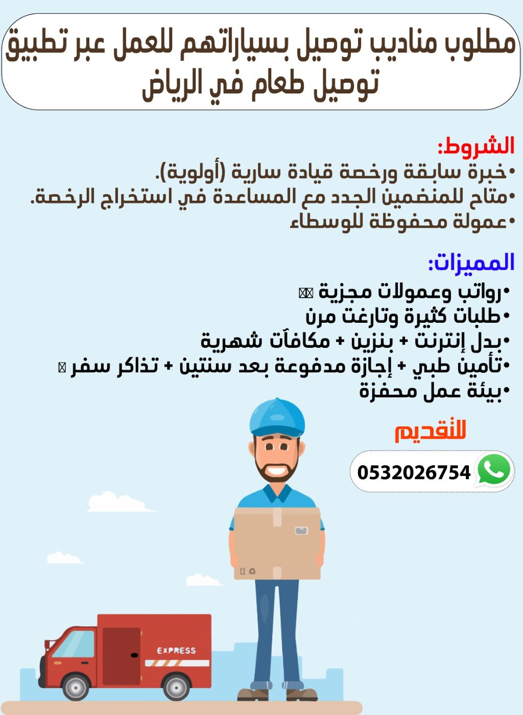 Delivery drivers required to work for delivery applications in Riyadh, Falah District. Sponsorship transfer is required. A valid driving license and residency are mandatory. We cover the first sponsorship transfer, accommodation, car, and fuel. Limited spots available