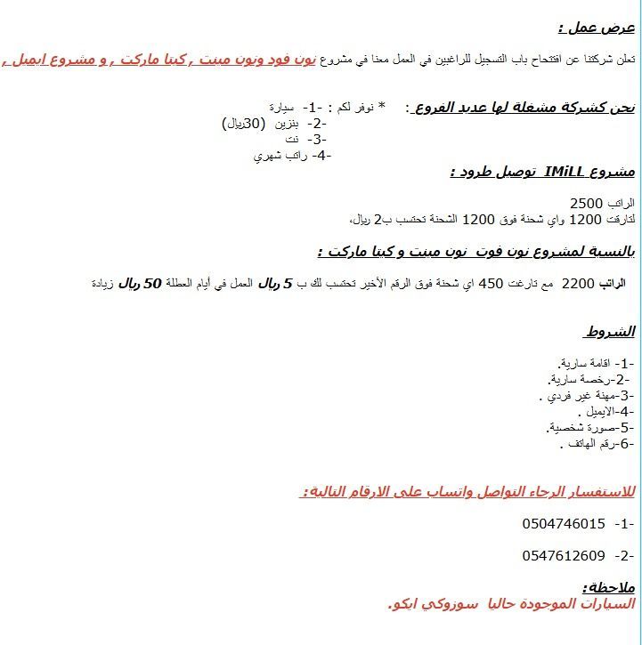 تعلن شركتنا في الرياض العليا عن فتح باب التسجيل للعمل في مجال التوصيل العليا ونوفر للمناديب ما يلي سيارة (المتوفر حاليا سوزوكي إيكو) بنزين يومي بقيمة 30 ريال انترنت راتب شهري حوافز تفاصيل العمل الراتب الأساسي 2500 ريال التارغت 1200 شحنة أي شحنة اضافية فوق 1200 تحتسب 2 ريال للشحنة تفاصيل اضافية للعمل الآخر الراتب الأساسي 2200 ريال التارغت 450 شحنة أي شحنة اضافية فوق التارجت تحتسب 5 ريال