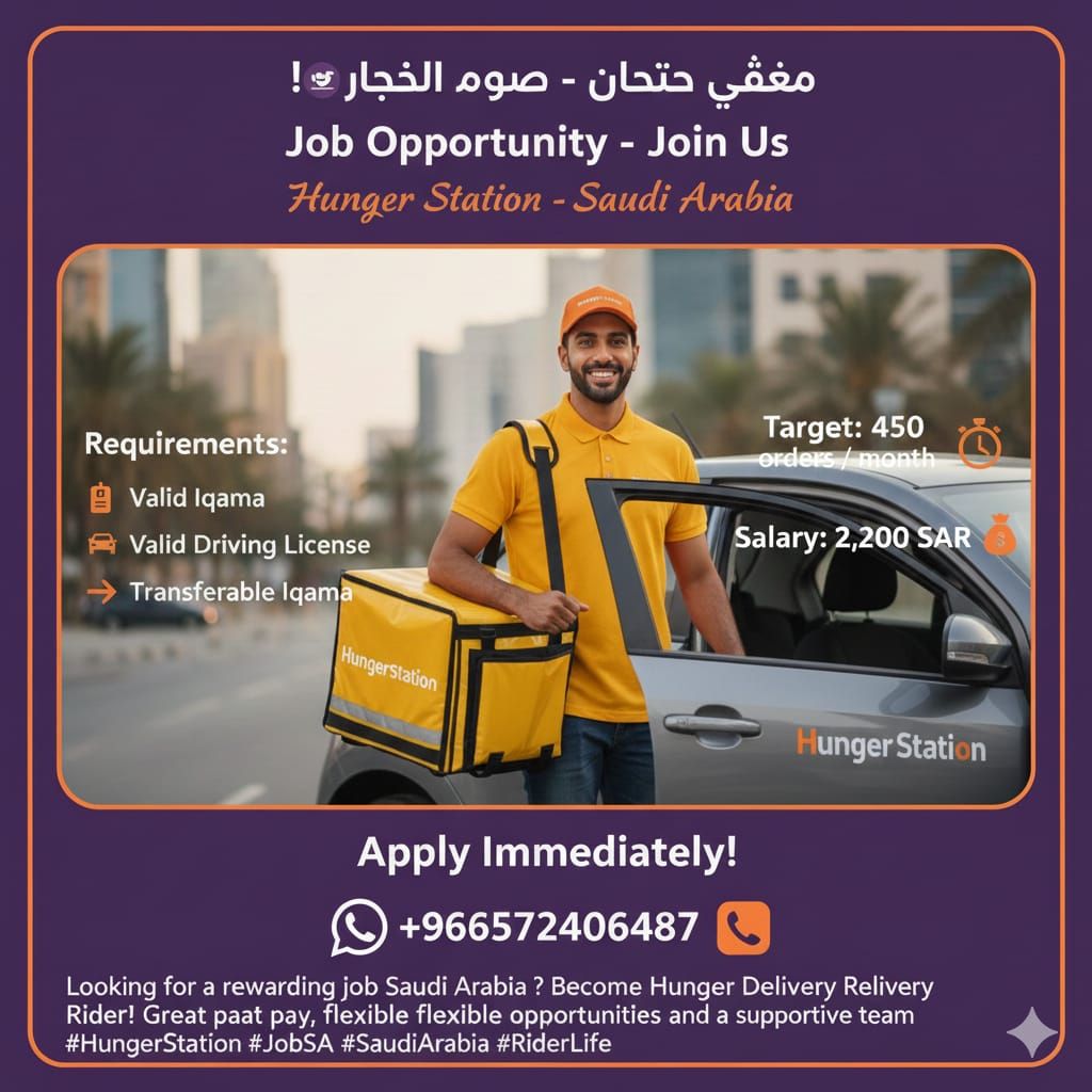 We are pleased to announce an excellent job opportunity with Hunger Station (Saudi Arabia) We are hiring Delivery Riders, with a monthly target of 450 orders. The salary offered is 2200 SAR. This position includes great benefits such as Internet, Company Car, Company Petrol, and Company Accommodation, all provided by the company. requirements Valid Iqama, Valid Driving License, and Transferable Iqama