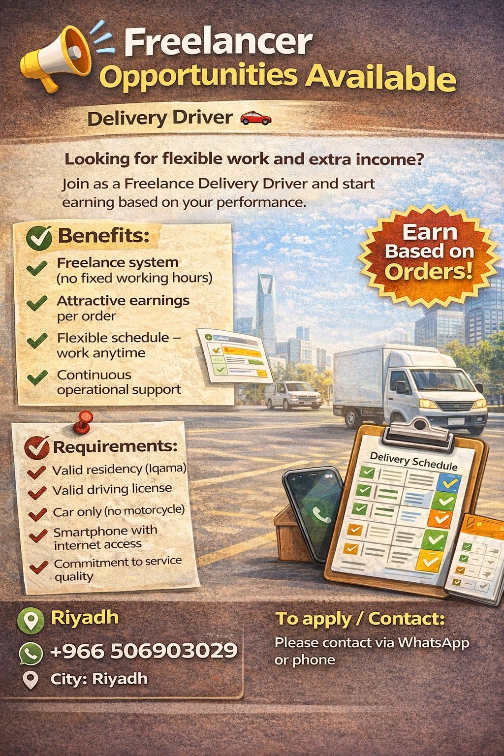 Freelancer Opportunities Available Delivery Driver - App Looking for flexible work and extra income Join as a Freelance Delivery Driver and start earning based on your performance. Benefits Freelance system (no fixed working hours) Attractive earnings per order Flexible schedule - work anytime Continuous operational support company location Riyadh - alolya
