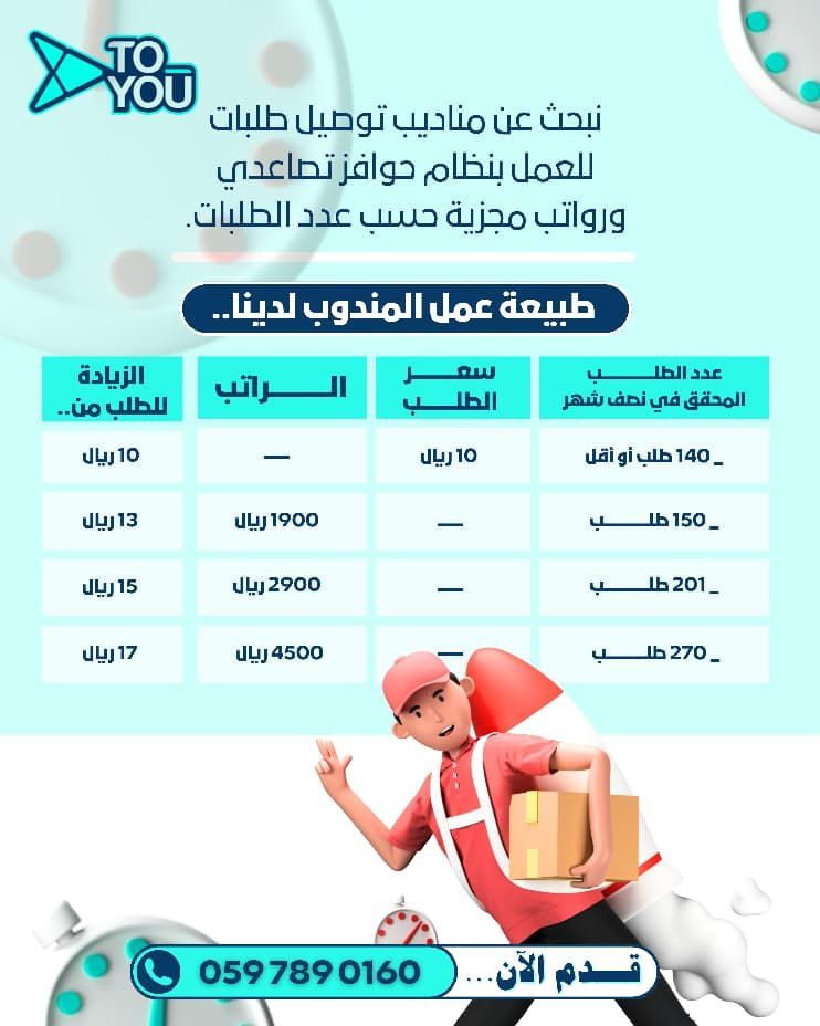 Delivery representatives wanted - Step Logistics Step Logistics (Exit 24) announces its need for delivery representatives to work in Riyadh. Income of up to 4500 riyals per half month Provided that 270 orders are completed within half a month Work based on orders A car and valid license are required Commitment and discipline during working hours For communication and inquiries