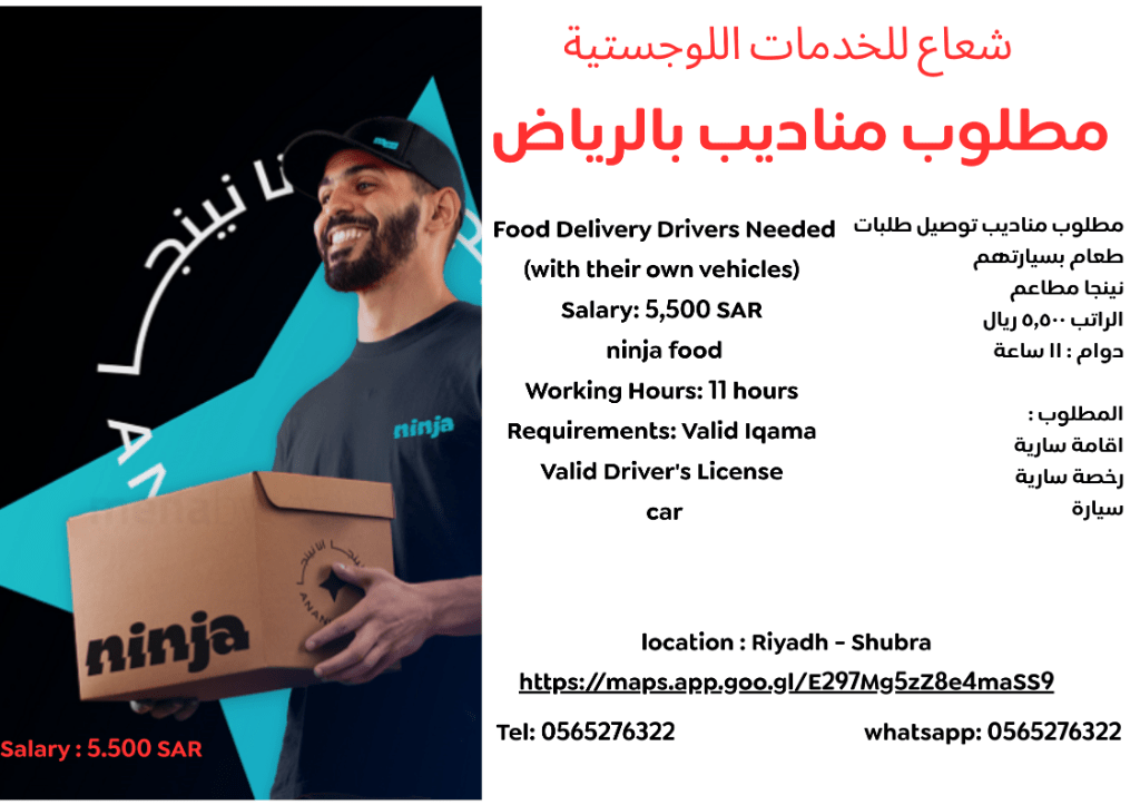 Shuaa Logistics Company Delivery Drivers Needed in Riyadh Ninja Restaurants Salary 5500 SAR Working Hours 11 Hours Requirements Valid Iqama Valid Driver's License Car Company Location Riyadh - Shubra