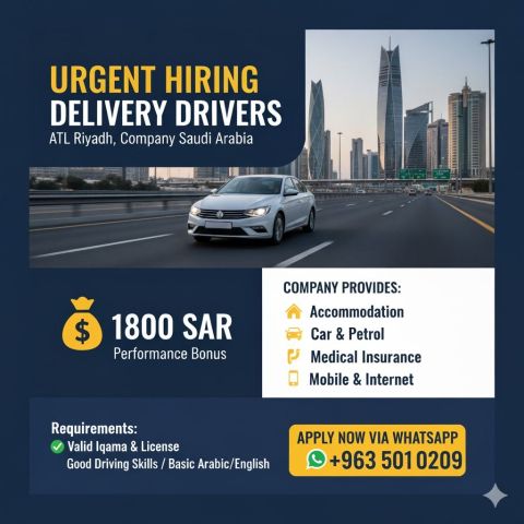 Delivery drivers required to work for delivery applications in Riyadh, Falah District. Sponsorship transfer is required. A valid driving license and residency are mandatory. We cover the first sponsorship transfer, accommodation, car, and fuel. Limited spots available