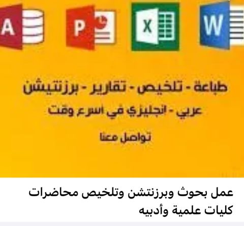 عمل جميع البحوث الجامعية والعروض البرزنتيشن ومشاريع التخرج والمساعدة للطلاب الجامعيين وتصميم وسائل تعليمية تواصل وتصميم سيرة ذاتية احترافية