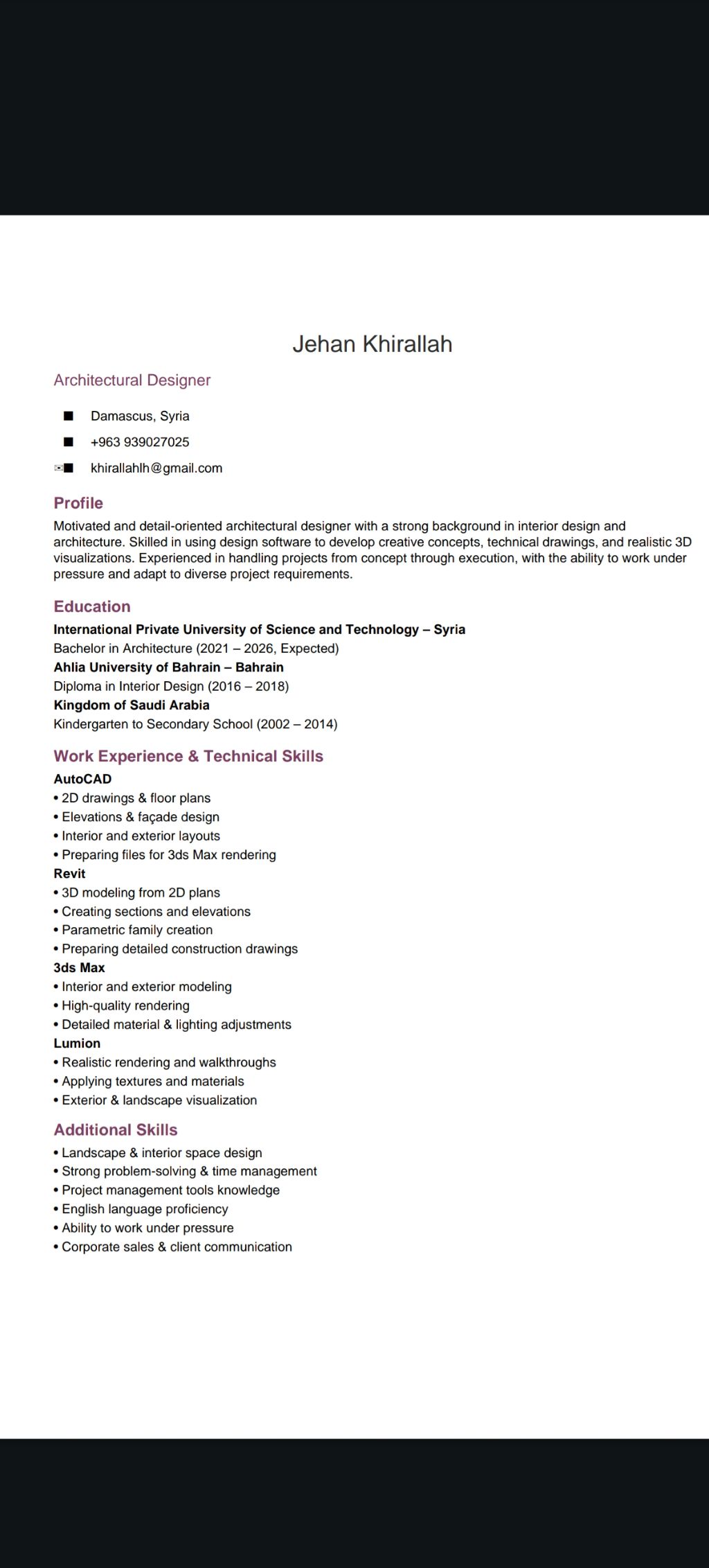 مصممة معمارية لدي خبرة في الصميم الداخلي والهندسة المعمارية ابحث عن عمل عن بعد أجيد العمل على جميع برامج التصميم AutoCAD - Revit - 3ds Max - Lumion رقم التواصل