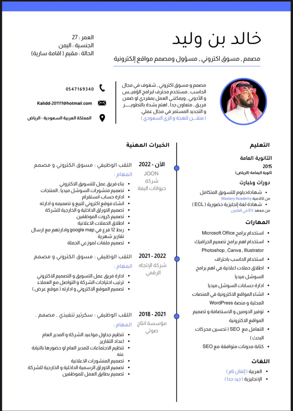 مصمم ومسوق متقن لبرامج الأوفيس متقن للفوتوشوب مدير سوشيال ميديا مدير ومصمم مواقع الكترونية على المنصات المحلية، أتحدث الانجليزية بشكل جيد) مستخدم جيد لأدوات الذكاء الاصطناعي. العمر 27 - الجنسية يمني (مواليد السعودية) الحالة مقيم (إقامة سارية)